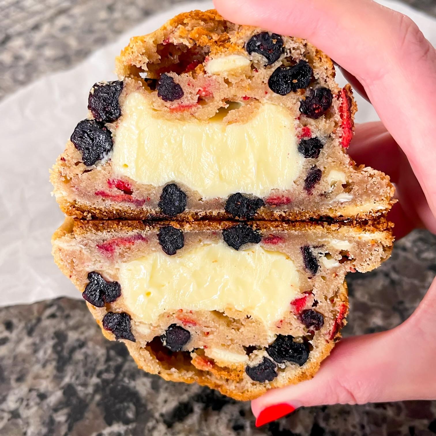 Delicious vanilla cookie with white chocolate chips, dried strawberries, dried blueberries and stuffed with delicious white chocolate cream.