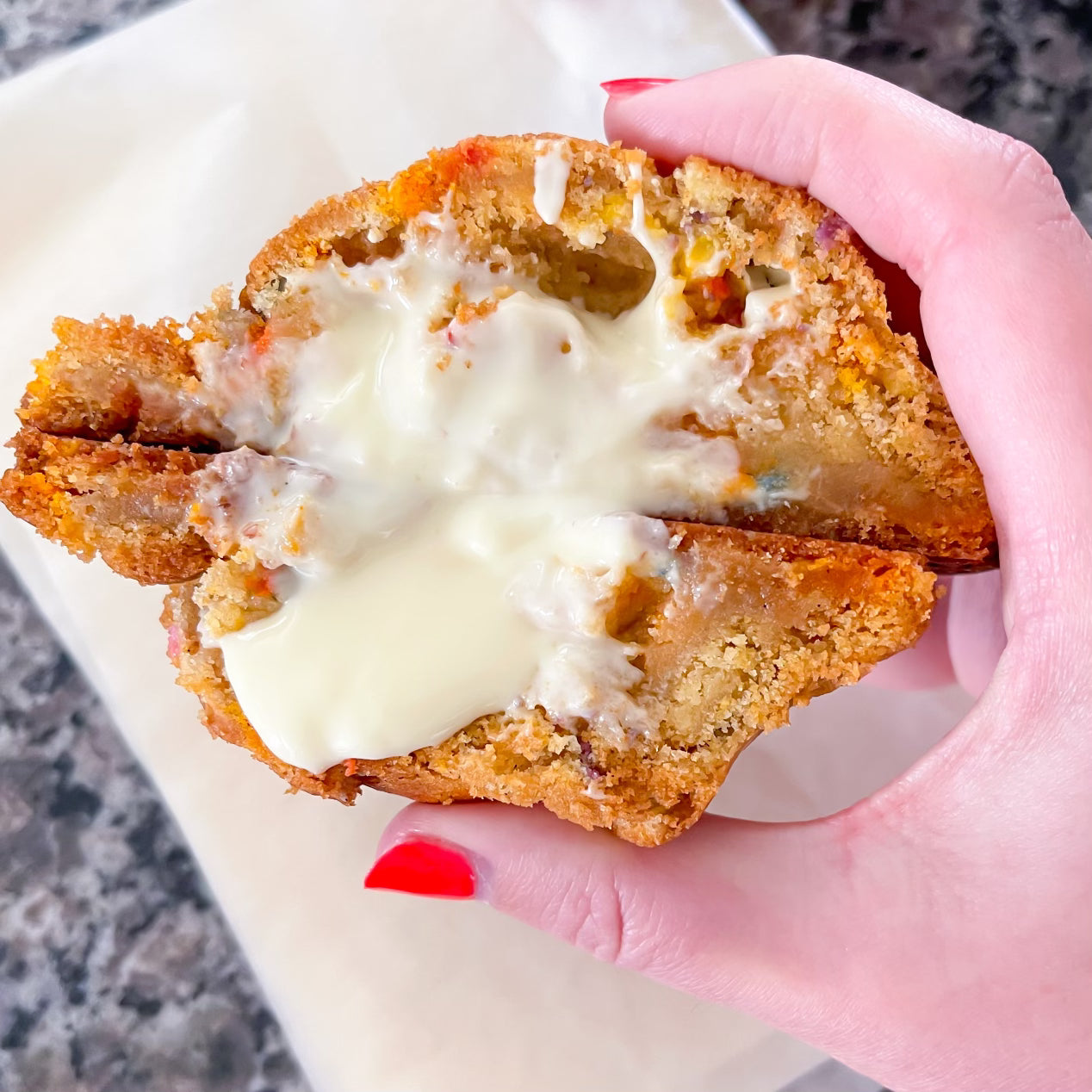 Delicious vanilla cookie with white chocolate chips, crushed vanilla oreo cookies and natural colored rainbow sprinkles, stuffed with delicious white chocolate cream.
