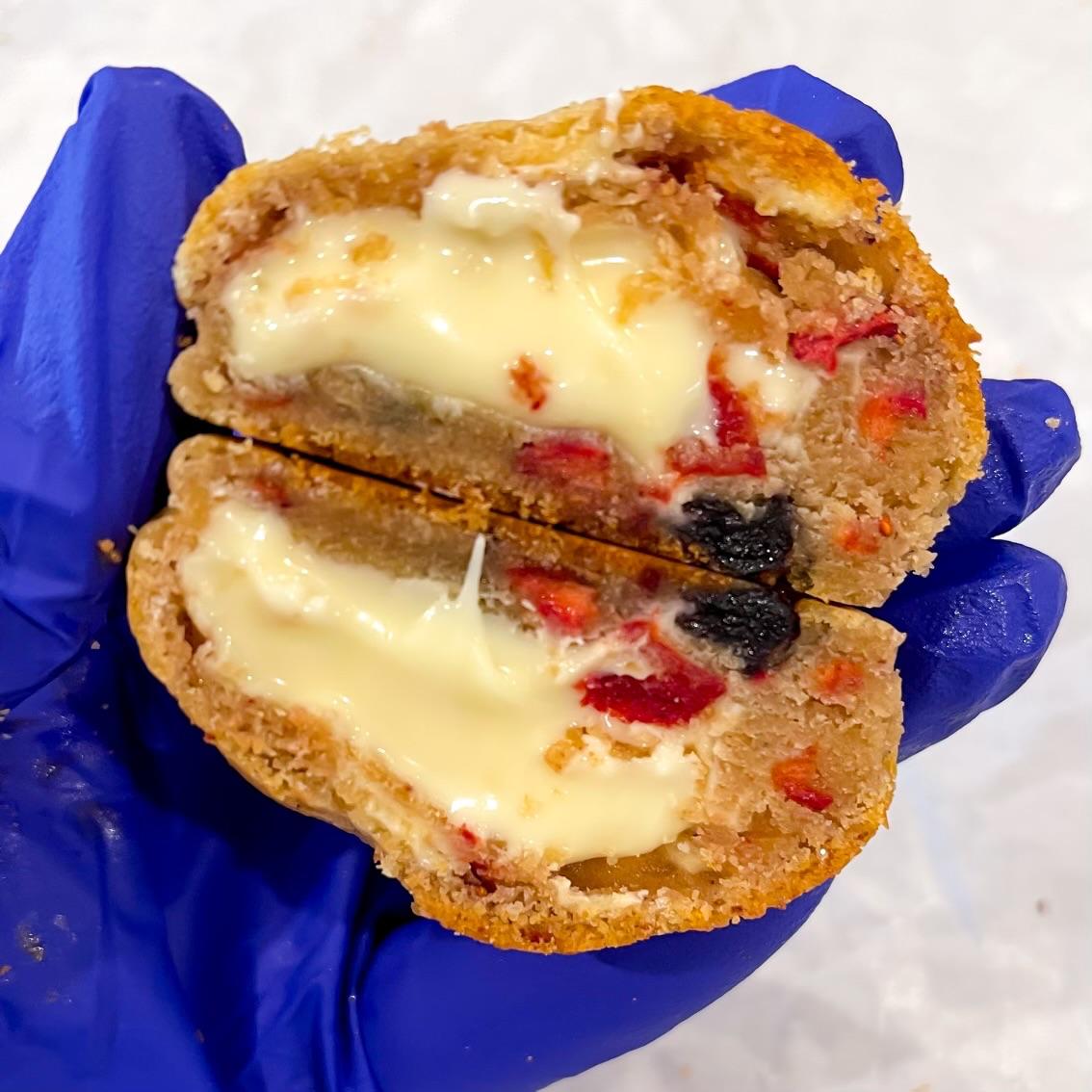 Delicious vanilla cookie with white chocolate chips, dried strawberries, dried blueberries and stuffed with delicious white chocolate cream.